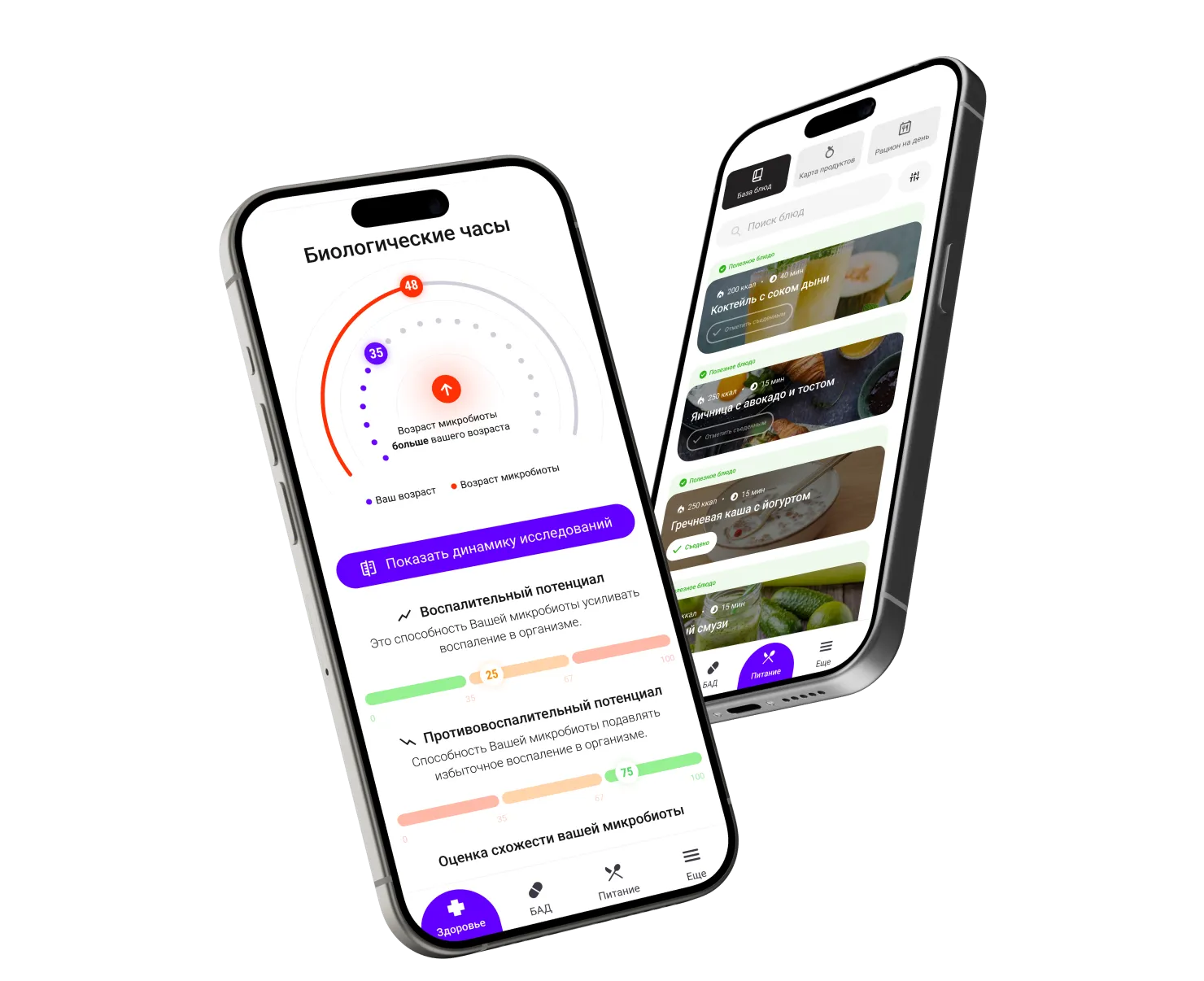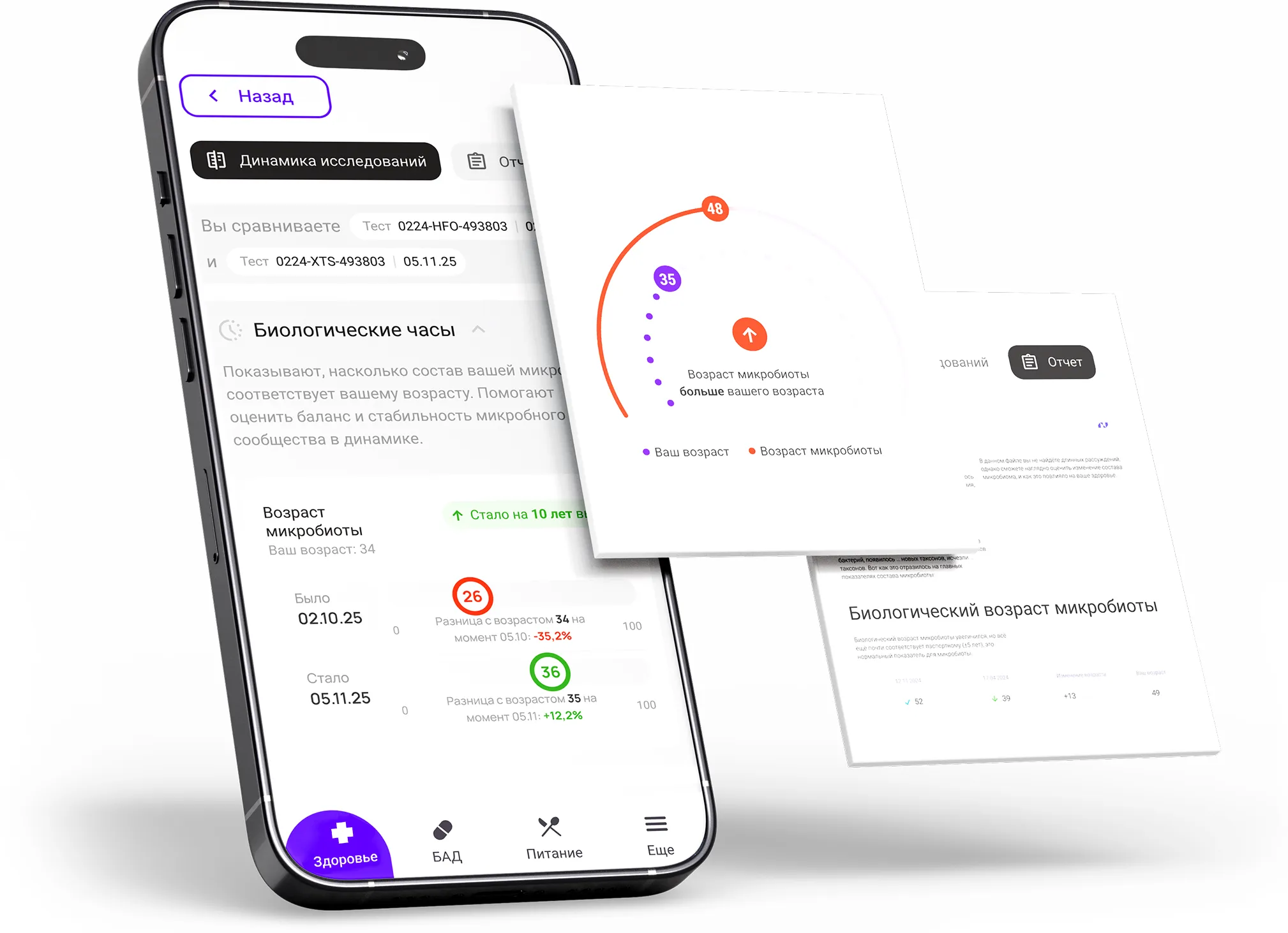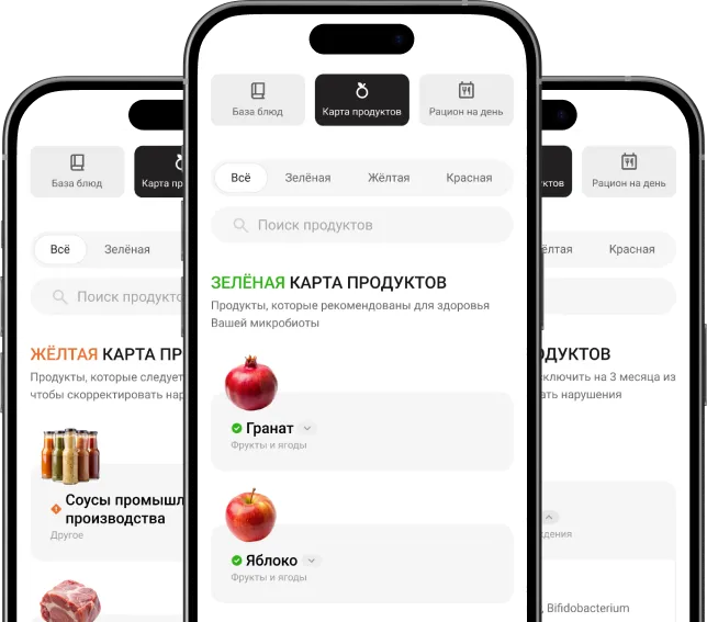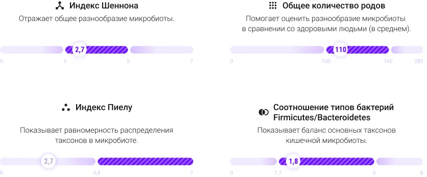 По готовности результатов исследования в приложении появляется подробный отчёт с ключевыми показателями здоровья микробиоты: